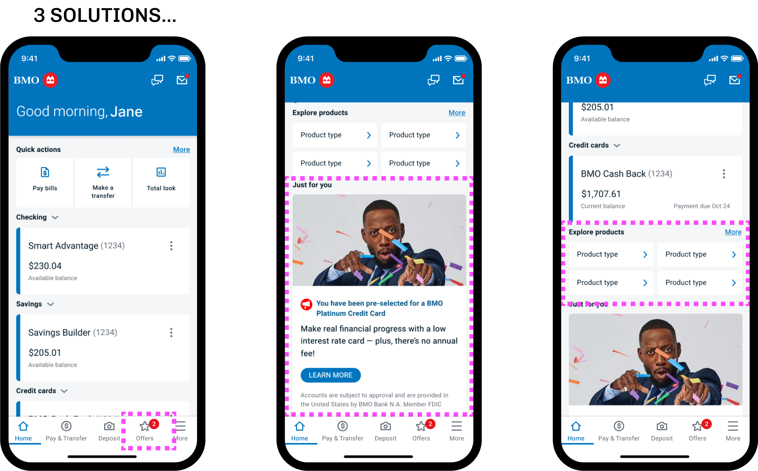BMO’s existing online banking featured a 50/50 split screen, with an oversized greeting taking up the entire left side of the screen and relevant content on the right side - this was the layout for every page in their online banking experience. Because of this inefficient use of space, when it came to the “accounts summary” page, promotional offers and ads were staggered in between account cards resulting in a confusing and incohesive user experience. Additionally, BMO had massive sales goals on the horizon following their acquisition of Bank of the West. The current design was too limiting and needed to be modernized while providing more flexibility for additional sales points.