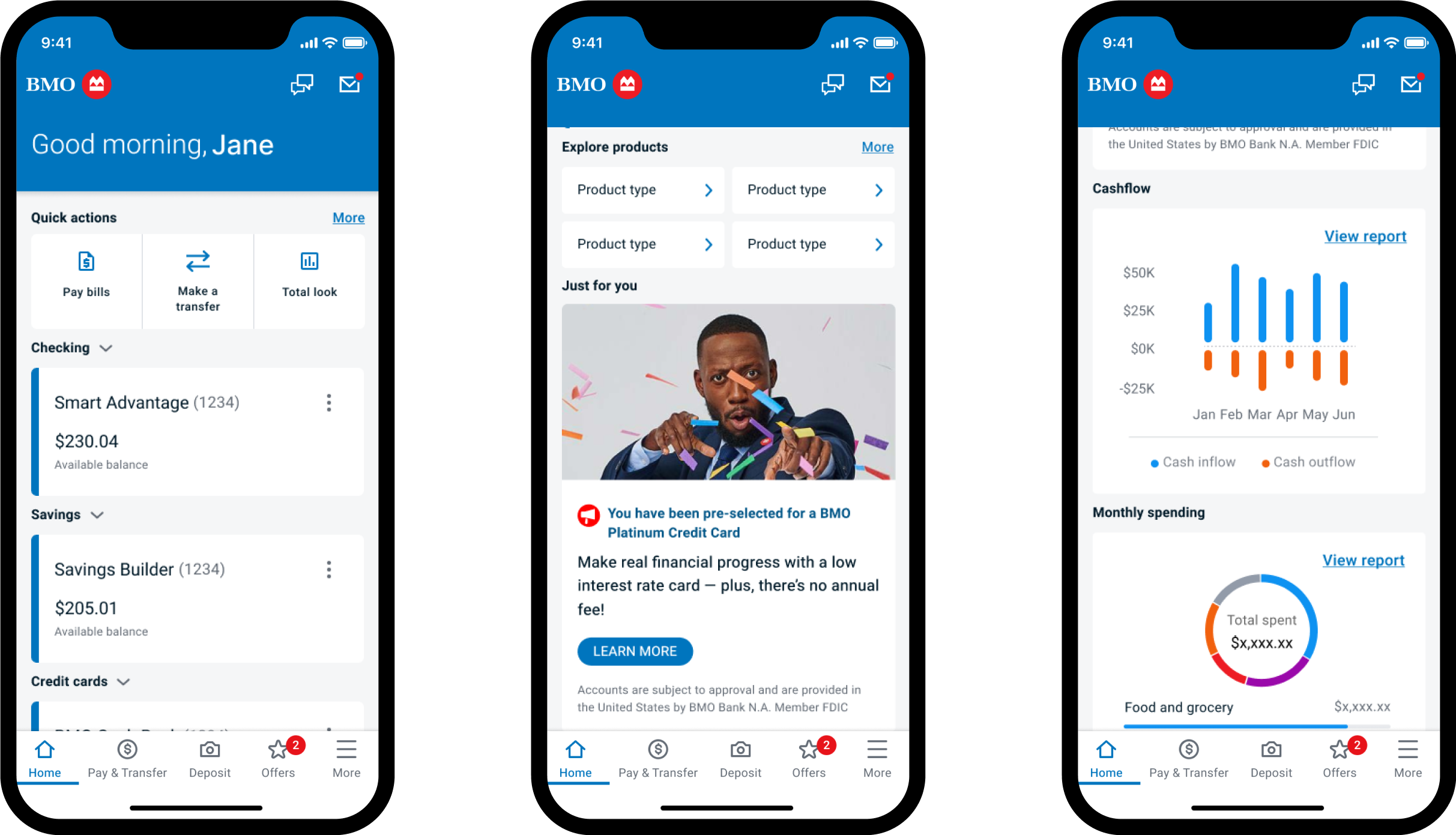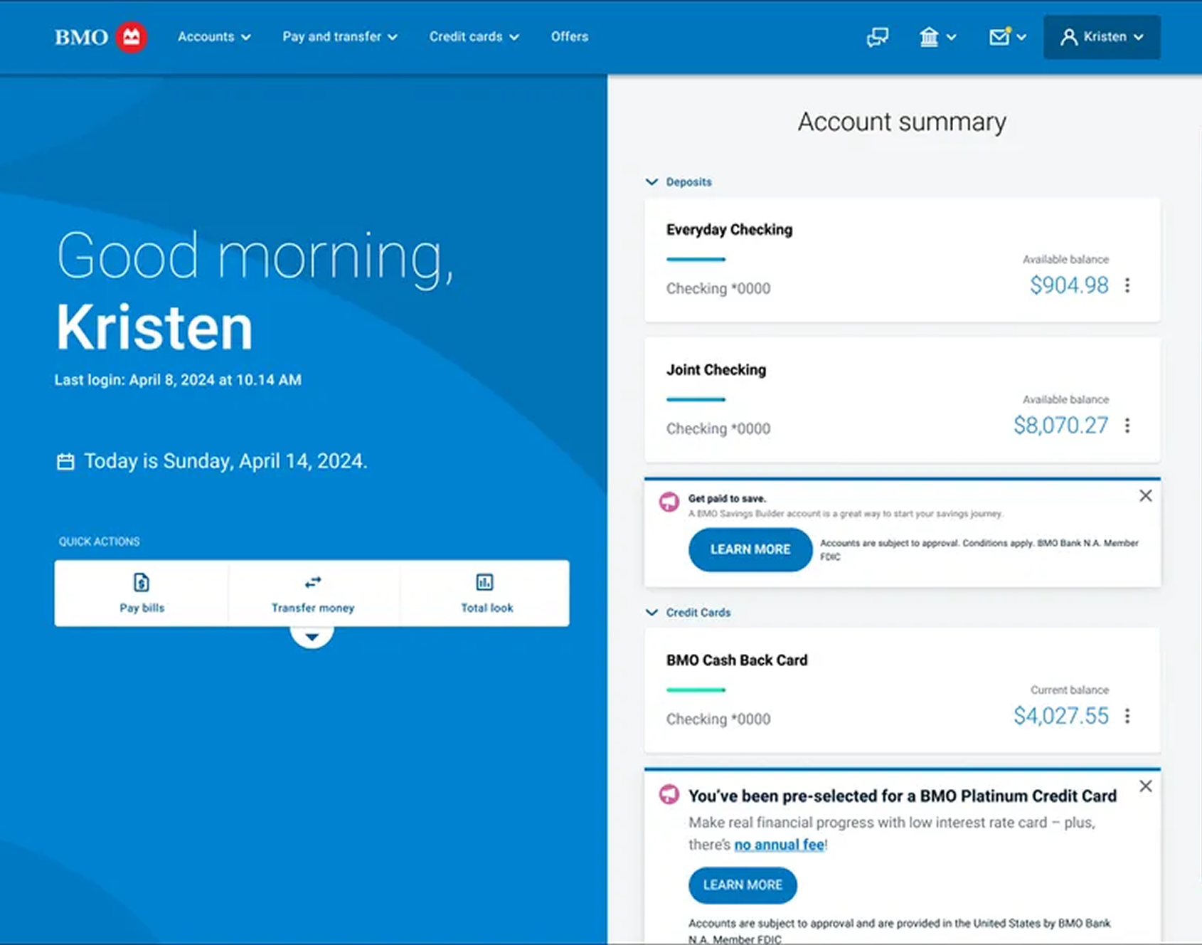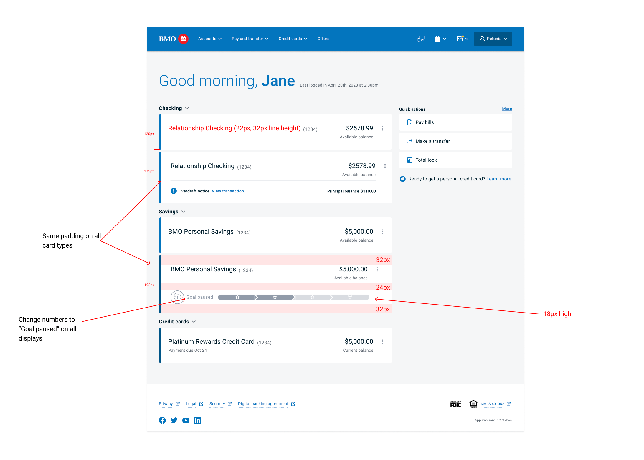 To modernize and redesign the U.S. Account summary page to function more like a dashboard, providing room for cross-sell opportunities and future features to increase the sales funnel, and in doing so, help BMO stand out amongst it’s U.S. competitors as a premium bank.